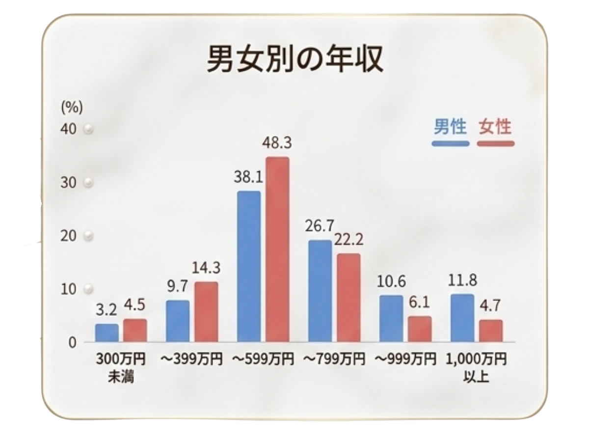 会員の年収は、男女共に400万円~600万円が最も多く、IBJ内での平均年収は一般の平均年収よりも高くなっています。